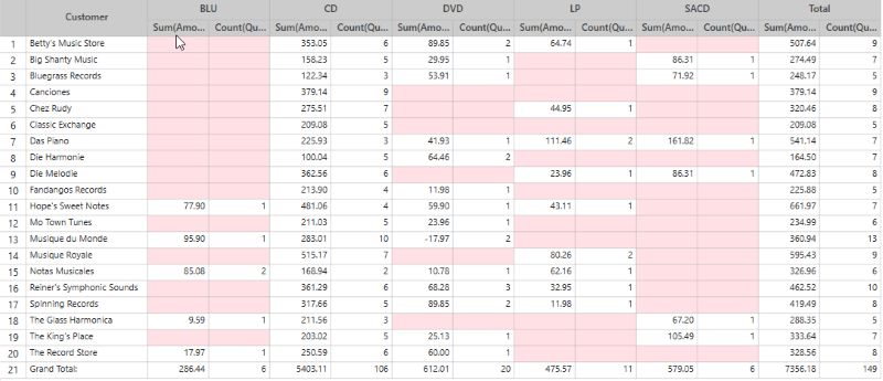 These two views are obtained from a single summary in which Customer is defined as a row, Media is defined as columns, and COUNT and Amount are defined as measures.