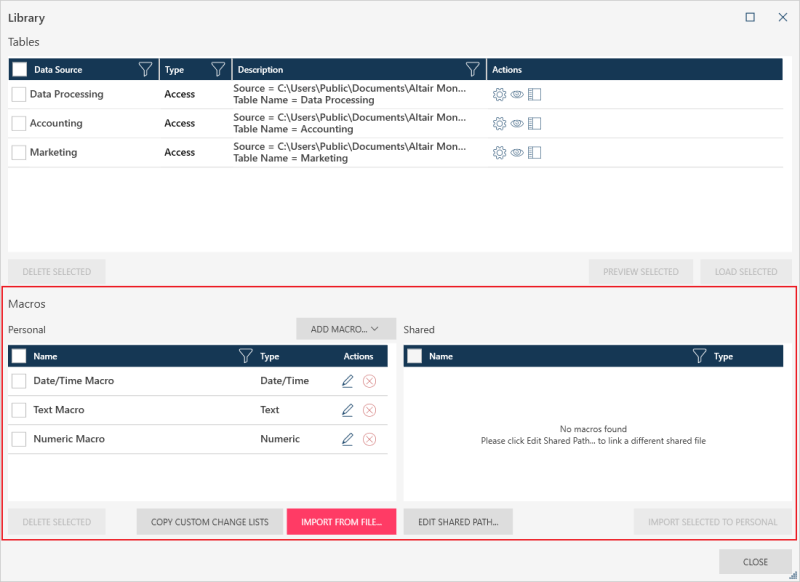 Shared - Shared macros are those created by other users in their own workspaces and saved to a Macro Collection (.dpmc) file. These files can be imported into your workspace, and you can work with them as if they were your own.