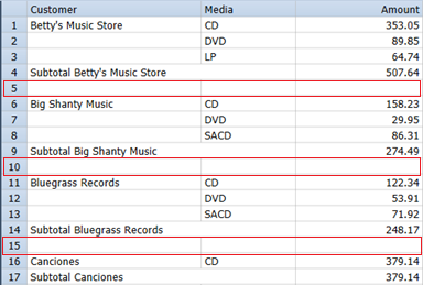 You can add blank lines to a summary to separate logical groups of information. Blank lines are added whenever the value of a selected key field changes. In the following illustration, blank lines are added whenever the value of the Customer field changes.