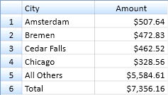 Using First n Values to create an analysis showing the top four sales cities. The City field is sorted in descending order according to the Amount (in sales) measure.