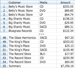 When Monarch Classic builds a summary, it generates a list of all unique values found in each key field. These lists are combined to form the summary matrix. Each line in the summary matrix represents a set of unique key values. For example, in the following summary, the fields Customer and Media are used. The Customer field contains 20 unique values, one for each customer in the report. The Media field contains 5 unique values, one for each media type in the report. In combination, these two fields can create a summary matrix of up to 100 lines, (20 customers * 5 media types). In practice, the summary would likely contain fewer lines, since not all media types are present for each customer (see illustration below).