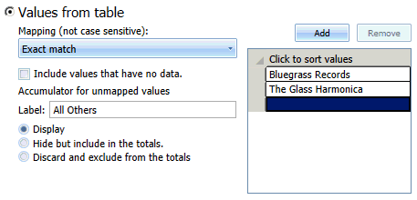 When selecting First N Values, Values from table, or Measure limit, you also have the option of grouping all other values under a single label that appears in the summary. This feature can be useful when breaking out specific key field values that you want to compare against the entire data set.