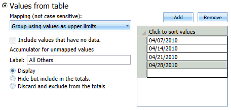 For key fields that contain date or numeric values, a somewhat different type of list might be desirable. For dates and numbers, you can create a series of ranges by specifying the upper limit for each range (e.g., 100, 200, 300 or 04/07/2010, 04/14/2010, 04/21/2010, etc.).