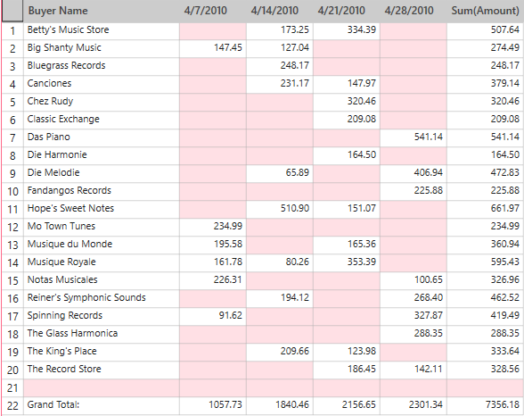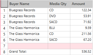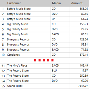 When Monarch Data Prep Studio builds a summary, it generates a list of all unique values found in each key field. These lists are combined to form the summary matrix. Each line in the summary matrix represents a set of unique key values. For example, in the following summary, the fields Customer and Media are used. The Customer field contains 20 unique values, one for each customer in the report. The Media field contains 5 unique values, one for each media type in the report. In combination, these two fields can create a summary matrix of up to 100 lines, (20 customers * 5 media types). In practice, the summary would likely contain fewer lines, since not all media types are present for each customer (see illustration below).
