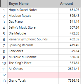 This option displays the first n values available to the summary (where n is a number that you specify). Sorting the summary can change the values that are returned. For example, this option can be used along with the Measure sorting option (see Sorting Key and Item Fields in a Summary) to create a Top n analysis of your data (see illustration below).