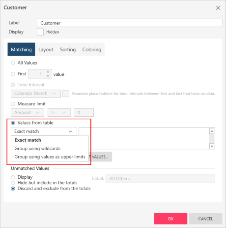 Using Exact match, you only group according to the key values that are listed. In the example above, you only group according to the four customers listed.