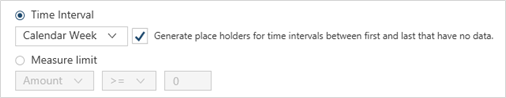 This option is enabled only when the key field is of the type date/time. When this option is selected, a drop-down list including possible time intervals (e.g., Calender Year, Calendar Month, Calendar Week, etc.) is activated. Choose a time interval by which keys should be grouped from this list. If you wish to create placeholder intervals for rows with missing data, check the box marked Generate placeholders for time intervals between first and last that have no data. Note that ticking this box also ticks the box marked Include values that have no data.