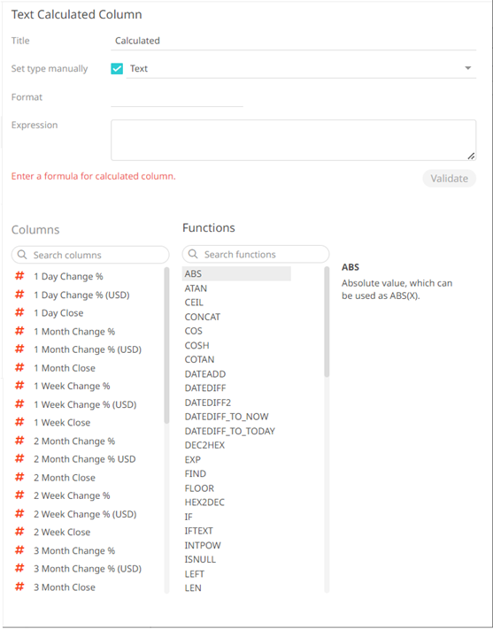 To search for a particular column or function, enter it in the Search Columns/Search Functions box.
