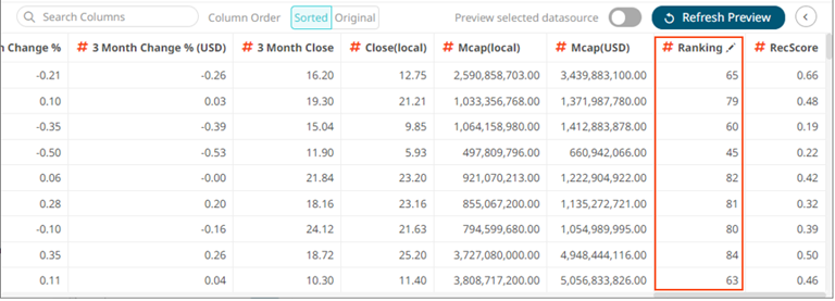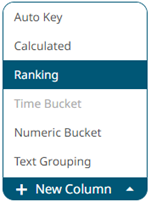 The Ranking Column pane displays which lets you create new numeric columns based on ranking other columns in your data source. The rank is calculated for each row across each time period.