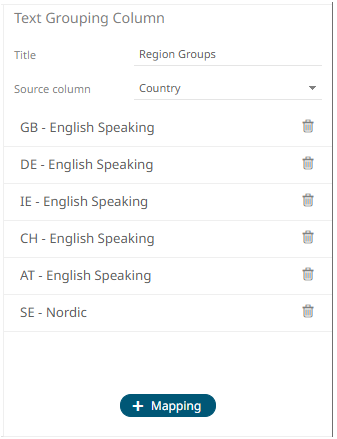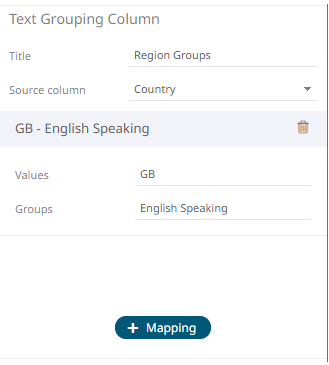 The text grouping instance is displayed with the default title (e.g., Region Groups) based on the initially selected Source Column (e.g., Region) on the Text Grouping Column pane.