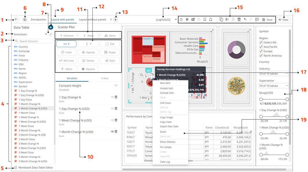 Dashboard Selected dashboard where you can add, edit, and delete visualizations, filters, actions, and general parts You can also create, edit, duplicate, rearrange, and delete dashboards. |