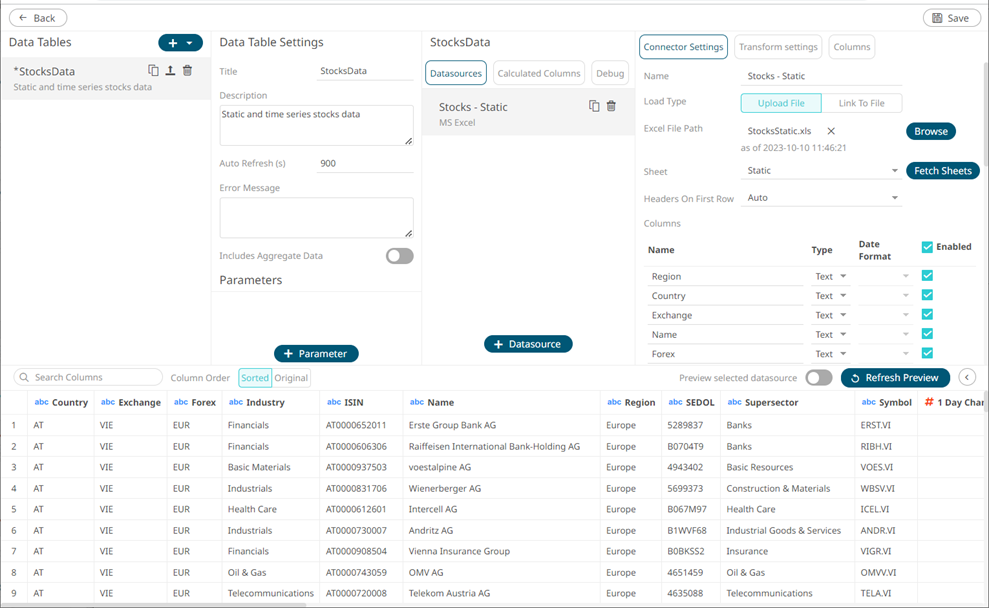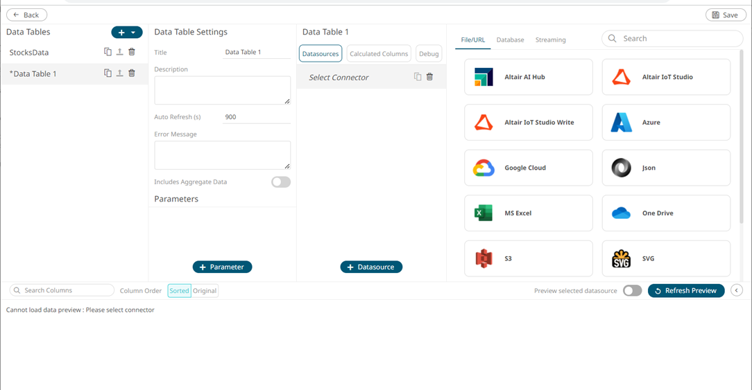 A new data table is added in the list and the Workbook Internal Data Table Editor view changes to display the enabled Data Table Settings and Data Sources panel.