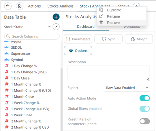 1. Right-click on the dashboard tab and select Remove in the context menu.