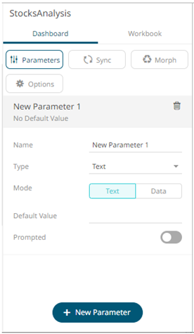 In addition to the parameters of the associated data tables that are used by visualizations and other parts on the dashboard, a Designer user can add new dashboard parameters which can be value sources inside actions and title of visualizations and parts.
