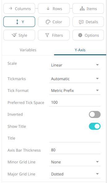 The X and Y axes of visualizations may include the following settings when accessed from the Breakdown section: