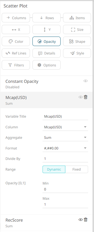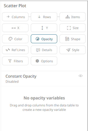 4. To associate other columns from the data table, drag and drop them to the Opacity variable drop area. Select one to display the corresponding configuration pane.