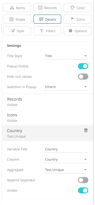 For the Details variable, dragging a text column to the Details shelf drop area creates a text details member.