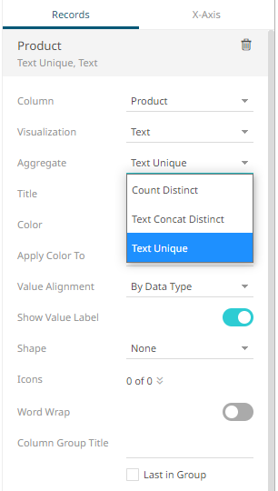 By default, the aggregates of Product and Company are both set to TextUnique.