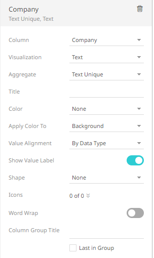 If the aggregate for the Company column is changed to TextConcatDistinct, all the text values for the corresponding breakdown columns are displayed in a comma delimited list: