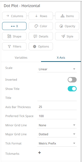 q X-Axis variable drop area then selecting the X-Axis tab (for Horizontal Dot Plots)