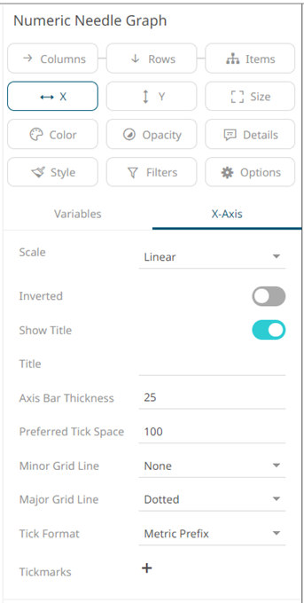 Other visualization-specific properties can be set by clicking on the X-Axis variable drop area and then selecting the X-Axis tab: