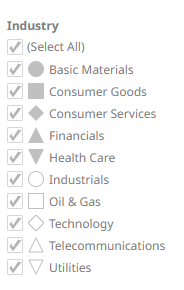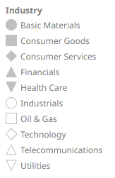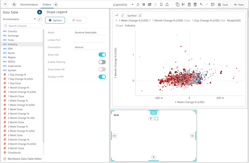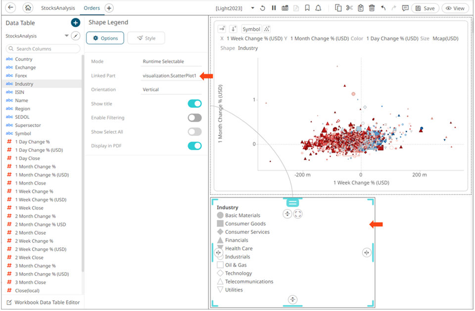 Shape Legend displays the shape variables of the associated visualization (Scatter Plot, Table, Time Combination, and Time series Scatter Plot). You can also set the orientation or enable the ability to do a filter or to display this part in the PDF output.
