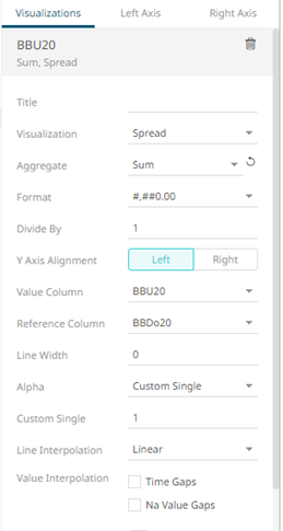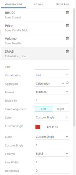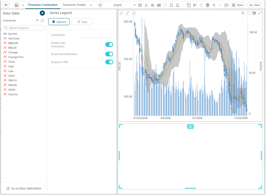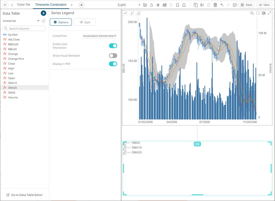 Setting the Custom Single color for the visual members helps display the Color Legend for layers in the Combination Graph, in cases where the Color variable is not used. Furthermore, the SMA10, SMA5, and SMA20 are the reference lines added under the BBU20 visual member. |