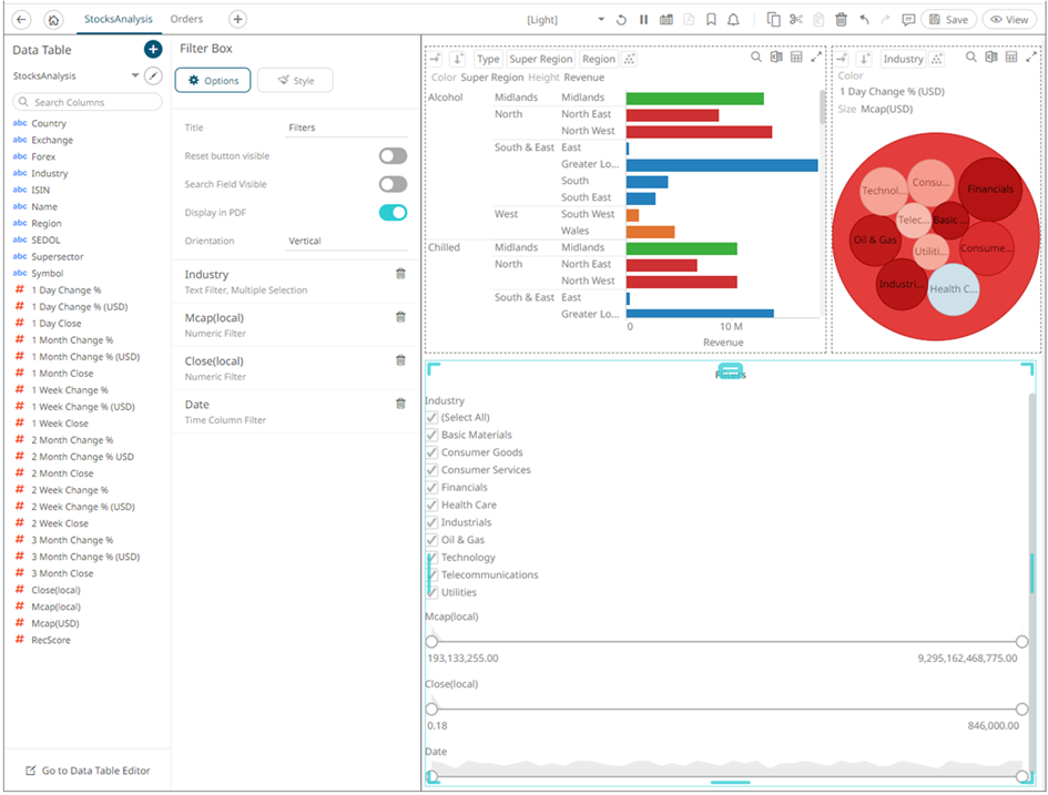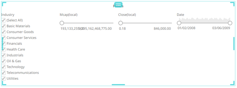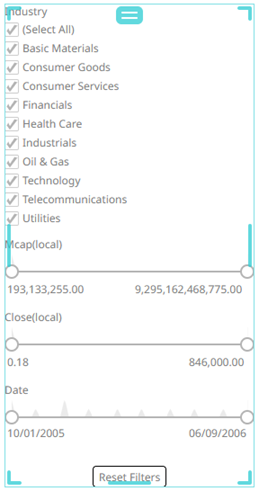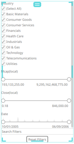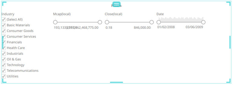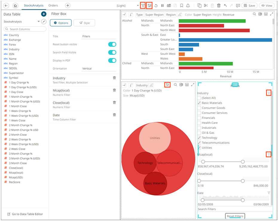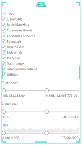 Dashboards specific filters can be applied by adding and populating a filter box which is a container for numeric and categorical (text) filters.