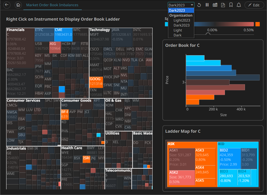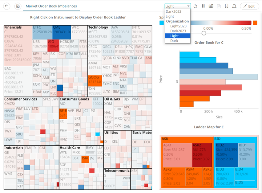 On an opened workbook, users can dynamically switch to one of the provided default workbook themes: Light, Light2023, Dark, or Dark2023 . These default themes are independent of workbooks and can be stored externally (e.g., Themes folder in the AppData).