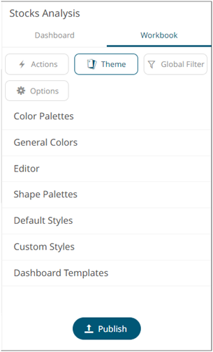 Workbook themes are set of configurable settings that affect all colors and fonts of dashboards and visualizations in a workbook. This configuration also includes setting which among the color palettes will be available for the Color variable in the visualizations. Furthermore, the general colors to be used in visualizations such as axis, background, border, and focus colors can be defined.