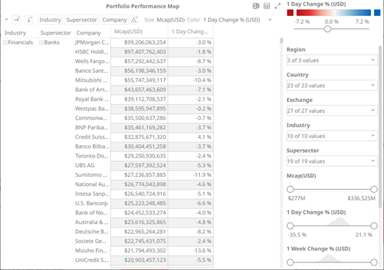 · Closing and opening the dashboard will revert to the original visualization. · Changing dashboard tabs will revert to the original visualization. · Applying filters on the dashboard will not cause the Table to be toggled back to a visualization but will display the filtered view of the Table. For example: Industry = Basic Materials and Telecommunications Consequently, toggling back will then display the filtered view of the visualization. The example below will only display Basic Materials and Telecommunications.