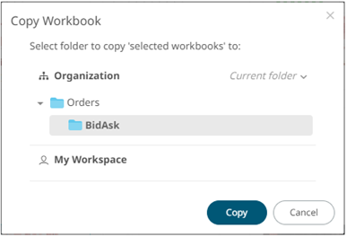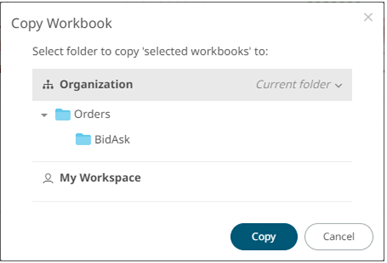 The Copy Workbook dialog displays with the folder or subfolders the user is allowed to copy the workbooks to.