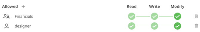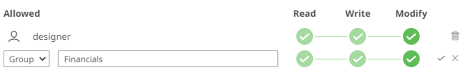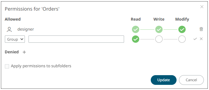 · A user with a Designer role is allowed not to grant himself permission to have access on folders or subfolders. This can be done either by granting permission to users or groups that they are not included or adding himself to the list of denied users or groups. · You can copy the user names in the Permissions dialog by highlighting the text then right-clicking, and selecting Copy in the context menu. |