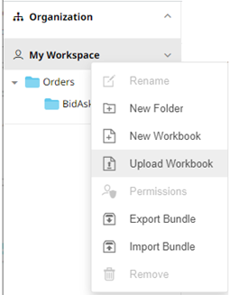 1. On the Workbooks page, click on a folder or subfolder and select Upload Workbook.
