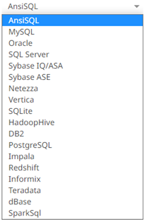 You can select any of the following SQL dialects: AnsiSQL, MySQL, Oracle, SQL Server, Sybase IQ/ASA, Sybase ASE, Netezza, Vertica, SQLite, HadoopHive, DB2, PostgreSQL, Impala, Redshift, Informix, Teradata, dBase, SparkSQL.