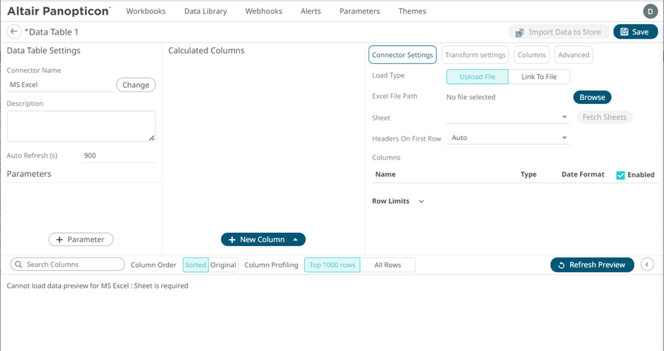 The Data Table Editor displays. The example below displays the connector settings for the MS Excel data source.