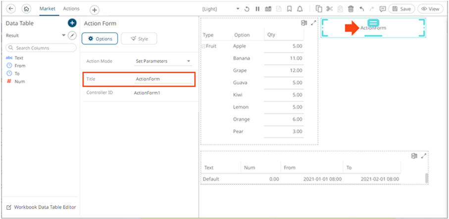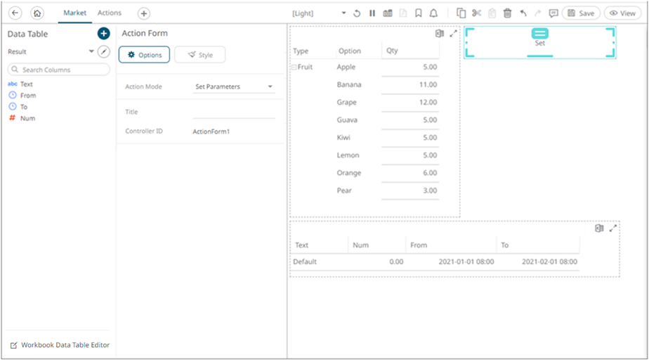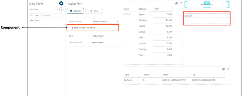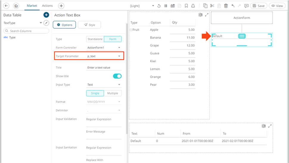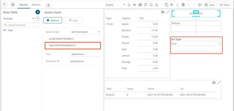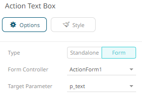 Sample 1: Using the Set Parameter mode and adding Action Text Box and Action Dropdown components to ActionForm1 with the following target parameters.