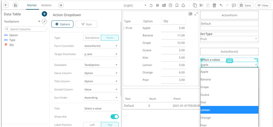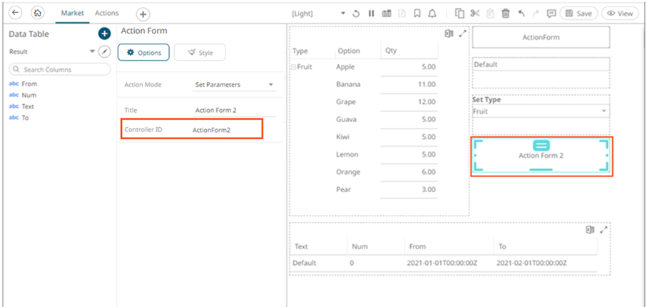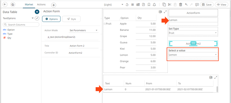 Sample 2. Using the Set Parameter mode and adding a new Action Form (ActionForm2) with an Action Drop Down component: