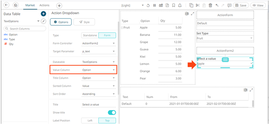 This means that the value selected in the dropdown list will update the p_text parameter on the dashboard after clicking ActionForm2.