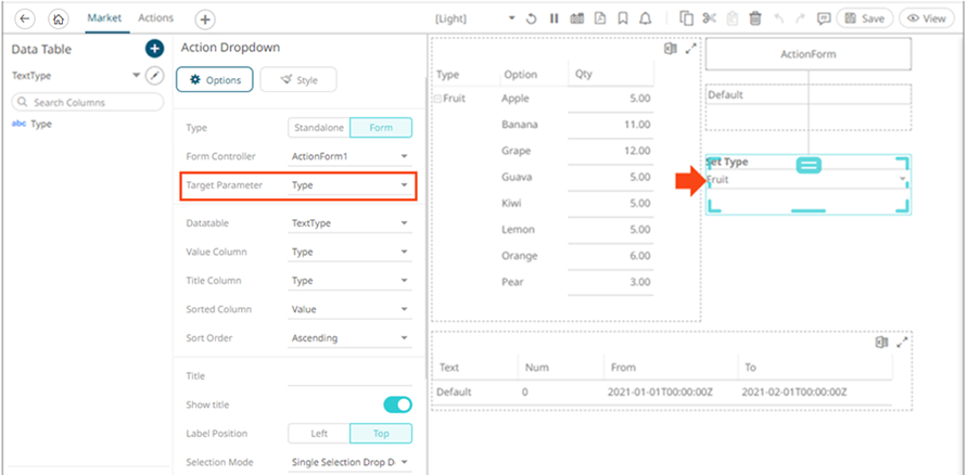 Upon selection of the action form, it additionally lists that the Type parameter is being set by the newly connected ActionDropDown1 part.