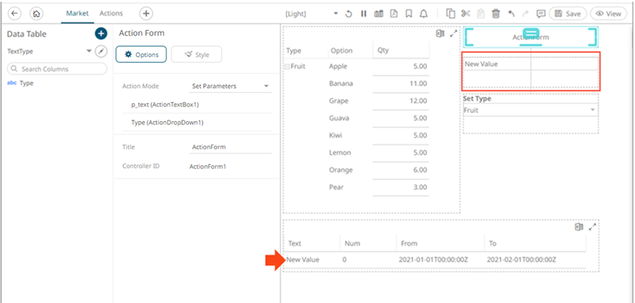 Changing the value in the action text box from Default to New Value and clicking the form button will trigger the Set Parameter action and set the value of p_text on the dashboard.