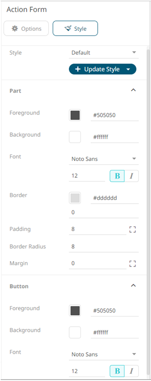 If published, the custom style configuration of the Action Form will be added to the Global custom styles list and can be applied to other parts.