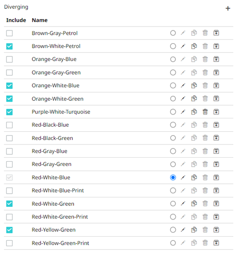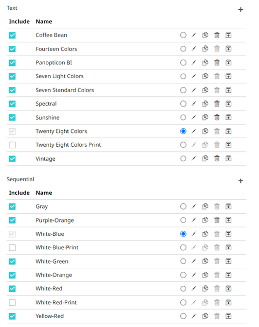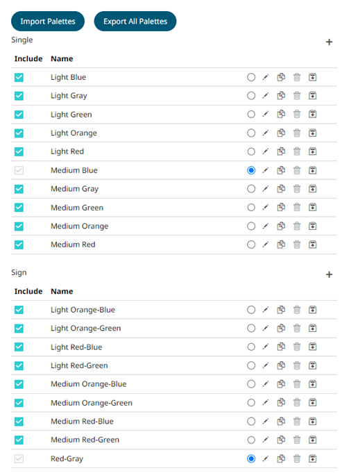 Single, sign, text, sequential, and diverging color palettes that are used in text or numeric color variables in visualizations can be created, imported, exported, modified, duplicated, or deleted in the Color Palettes tab of a Theme page.