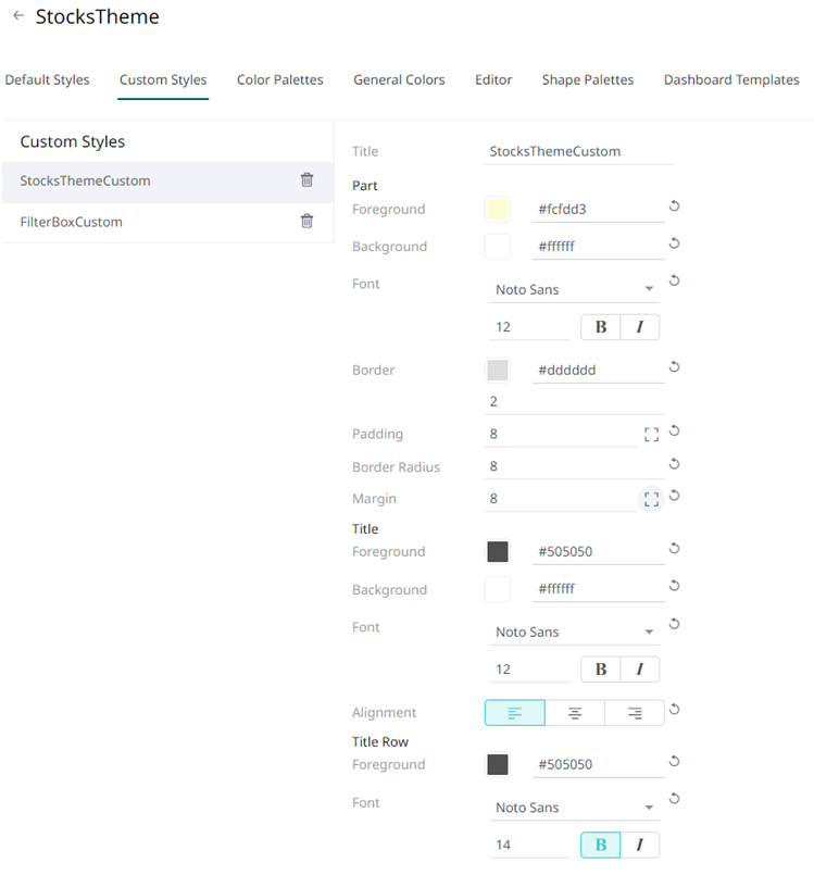 Published custom style configuration of a part can be modified in the Custom Styles tab and can be applied to other parts.
