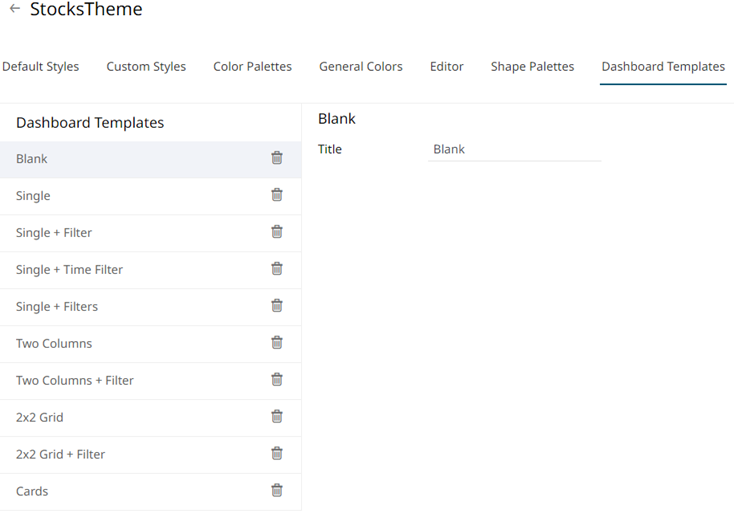 Default dashboard templates are provided in Panopticon. You can modify the name or delete default and new dashboard templates.