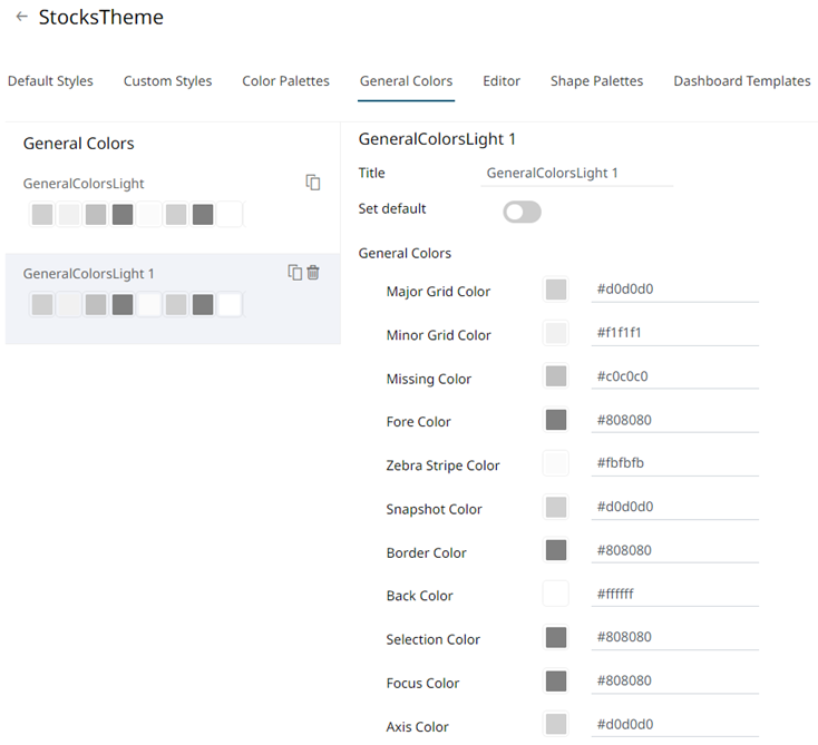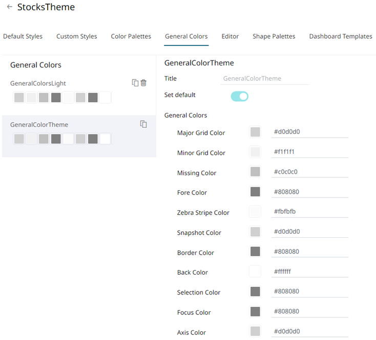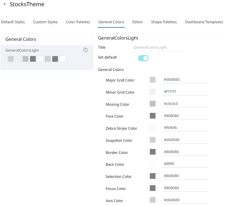 Select or specify the new general colors: AxisColor, BackColor, BorderColor, FocusColor, ForeColor, MajorGridColor, MinorGridColor, MissingColor, SelectionColor. SnapshotColor,ZebraStripeColor.
