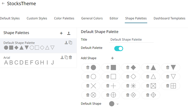 When you define the shape palettes of a theme, you specify the settings of shape palettes and add, upload, download, duplicate, or remove them.