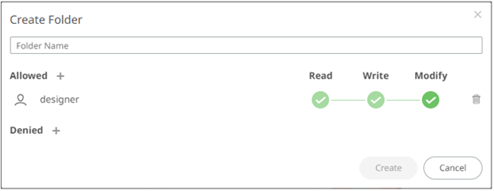 · The Designer user is available under the Allowed section by default with Read, Write, and Modify permissions. · Removing the Designer user will mean they will not have access to this folder and its subfolders. |