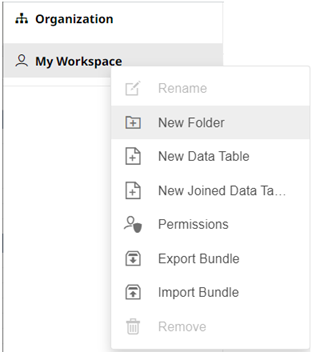 Users that log on with a Designer role: · will have their own personal folder created and displayed on the Data Library page (i.e., My Workspace). This personal folder is where Designers can create data tables and joined data tables. · is not allowed to create a folder on the root folder. |