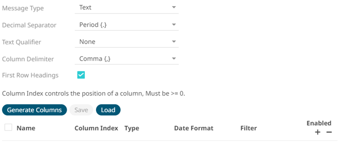 If Text has been selected, confirm the Decimal Separator, Text Qualifier, Column Delimiter, and if the first row of the message includes column headings.
